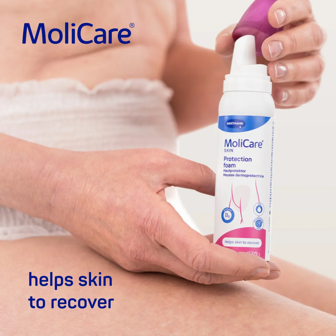 MoliCare Skin Protection Foam is an effective barrier to protect irritated skin from the effects of incontinence by forming a transparent protective film on the skin. Zinc oxide free ensures pad absorbency is not impacted. The innovative formula is enriched with the Nutriskin Protection Complex to strengthen the skins natural protection and regeneration function.